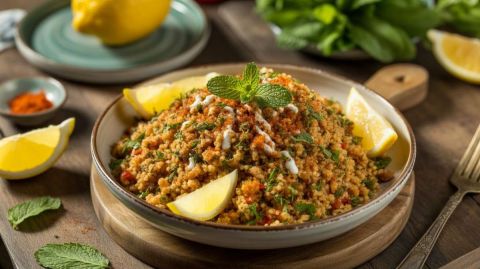 Le taboulé, originaire du Liban, est traditionnellement préparé avec du boulgour et une variété d'herbes fraîches. Cette version rapide, utilisant de la semoule, permet de conserver les goûts authentiques du Moyen-Orient tout en simplifiant la préparation.
