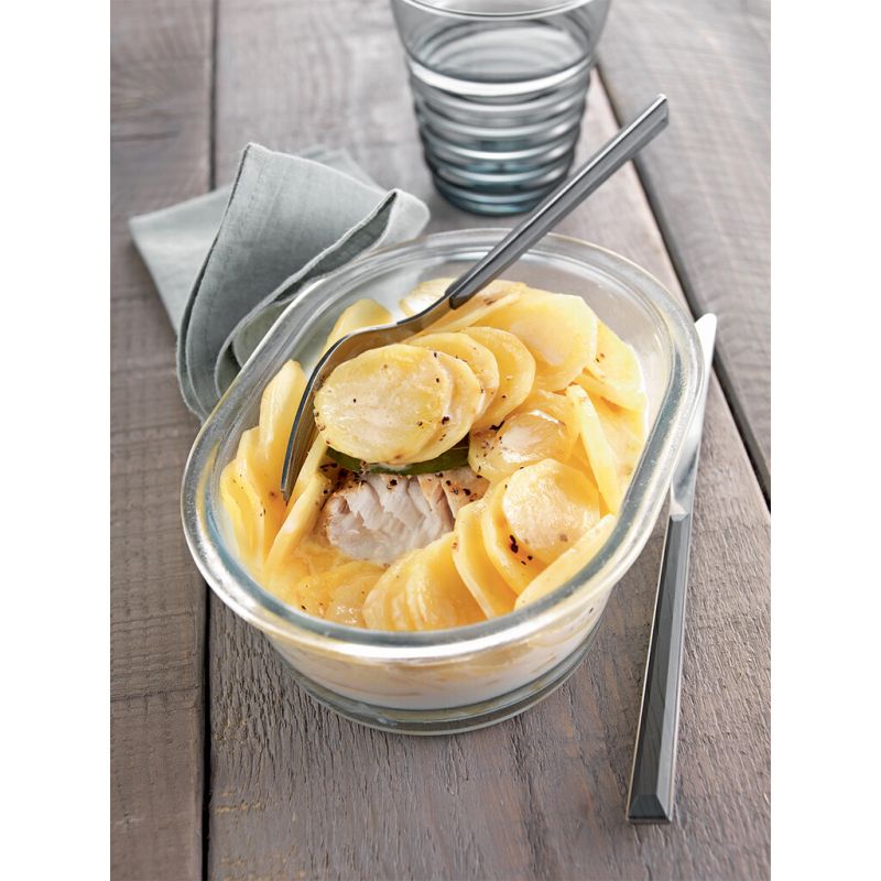 - Ajoutez ensuite le dos de merlu, recouvrez le tout avec quelques feuilles de laurier, puis terminez par le reste des pommes de terre.