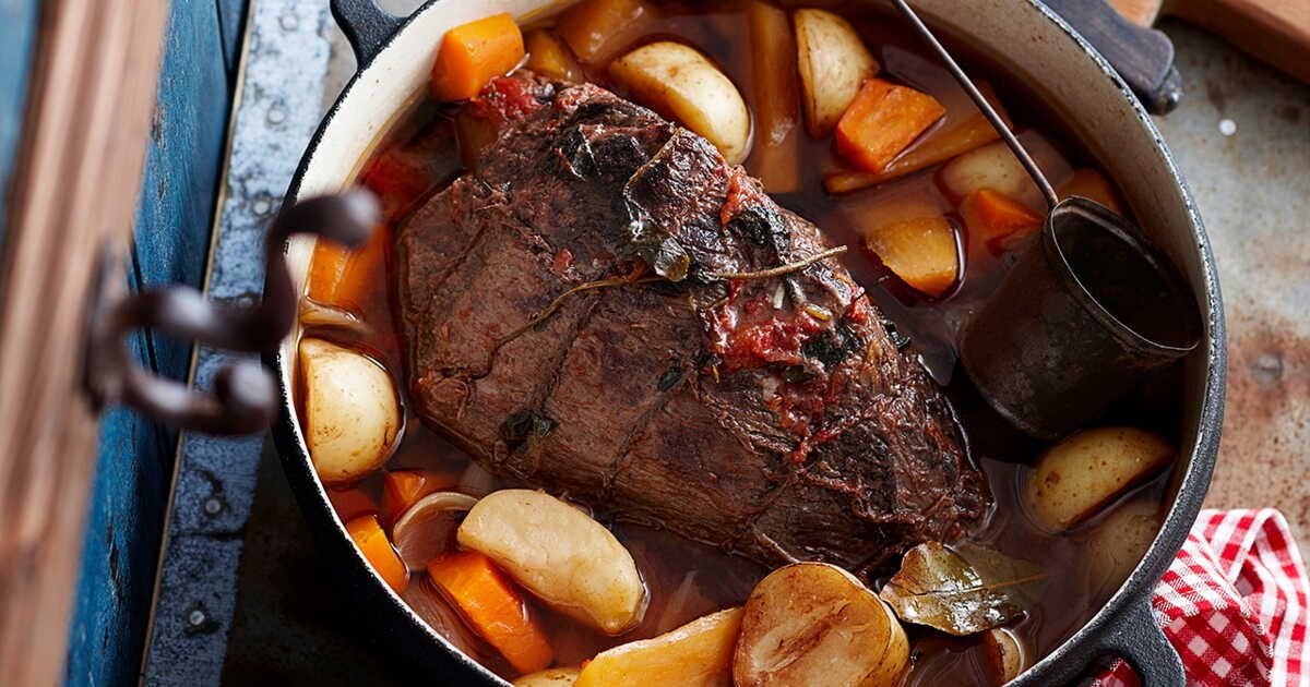 - Remettez le paleron dans la cocotte, couvrez avec le bouillon de bœuf et ajoutez les herbes de Provence.